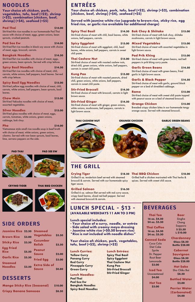 Stir-fried thin rice noodles in our homemade Pad Thai sauce with choice of meat, eggs, green onions, bean sprouts, crushed peanuts.