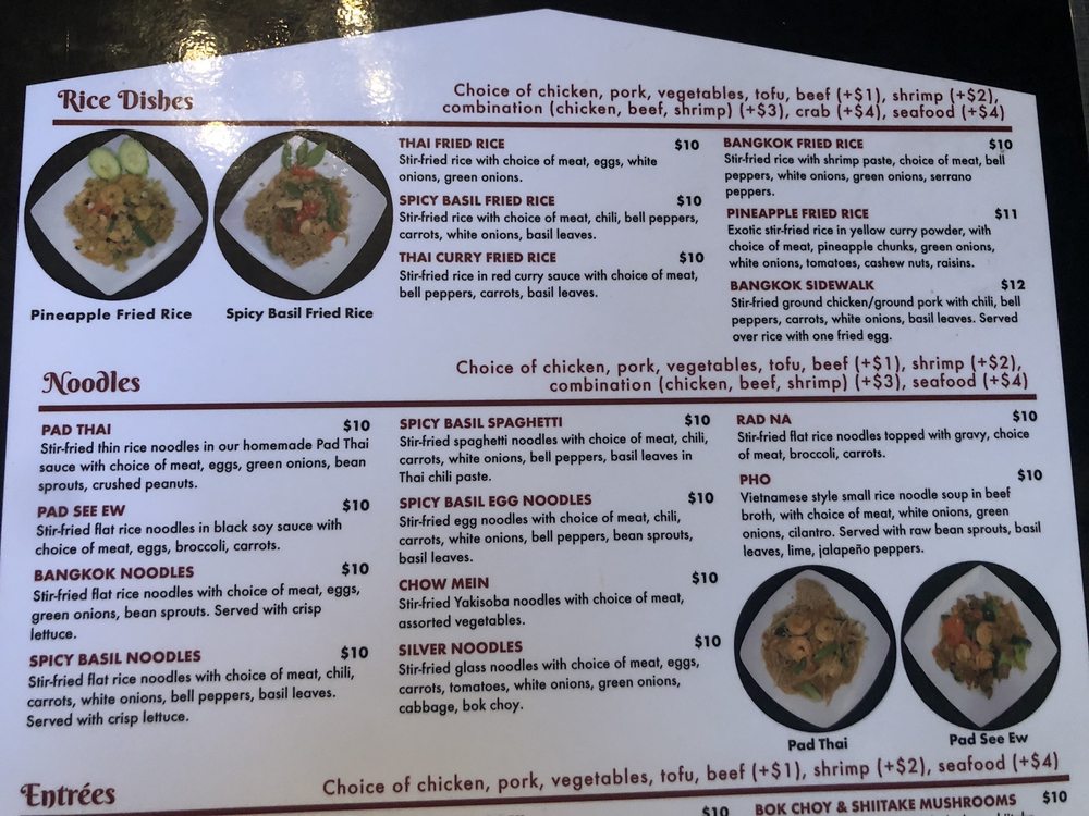 Stir-fried rice in red curry sauce with choice of meat, bell peppers, carrots, basil leaves.